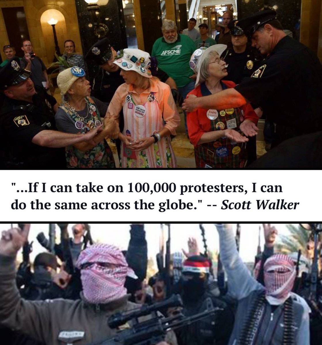 "It's disgusting that Gov. Walker would compare everyday heroes educators to international terrorists," said Betsy Kippers, a teacher and president of the Wisconsin Education Association Council.