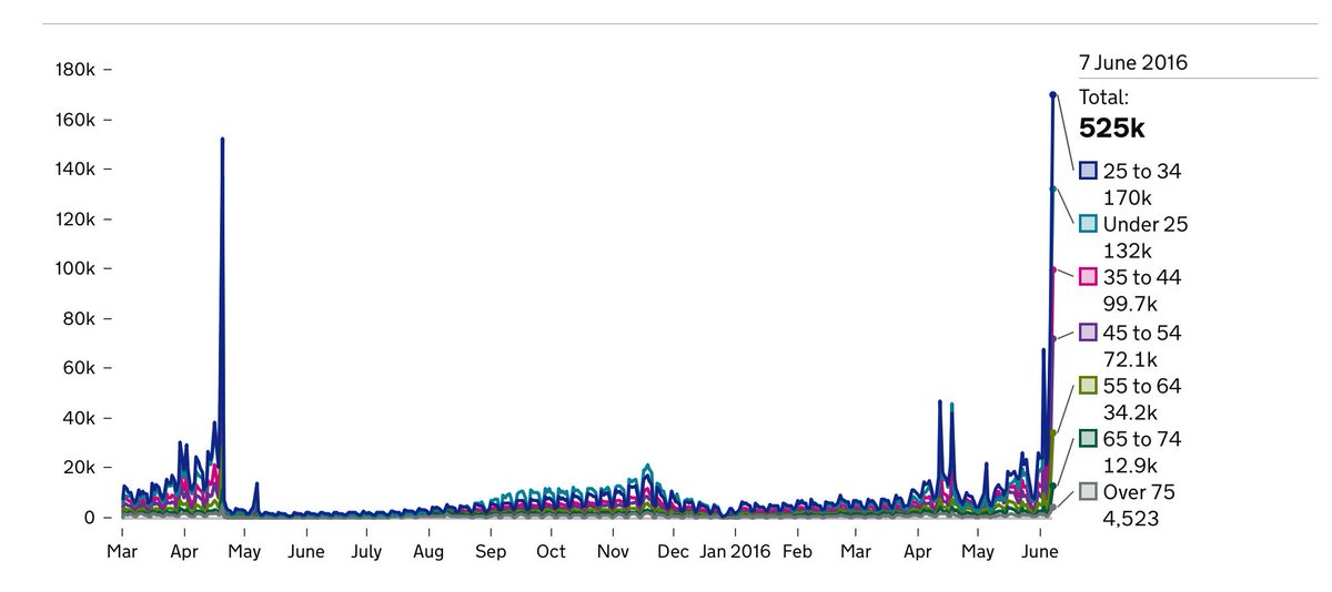 It also shows that the peak users came at 22:15 BST when 50,711 people were using the service at the same time. There were 26,000 people on the site at 23:55 BST and 20,416 people using the site at 12:01 BST, just after the deadline.