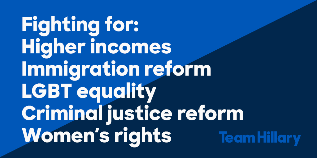 Income inequality, Immigration reform, LGBT equality, Criminal Justice reform (BlackLivesMatter) Women's rights.