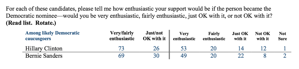 In addition, the survey finds Clintons support is deeper and sturdier than Sanders across many areas, with 53 percent saying they'd be very enthusiastic with her as the party's nominee. Most tellingly, 83 percent of her voters say their minds are made up to support Clinton.