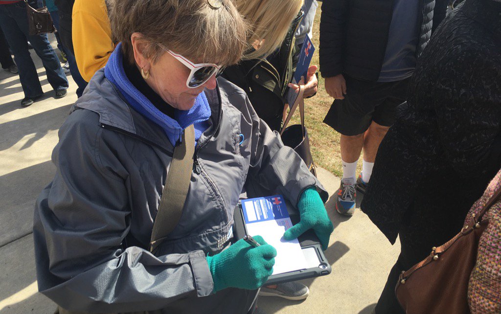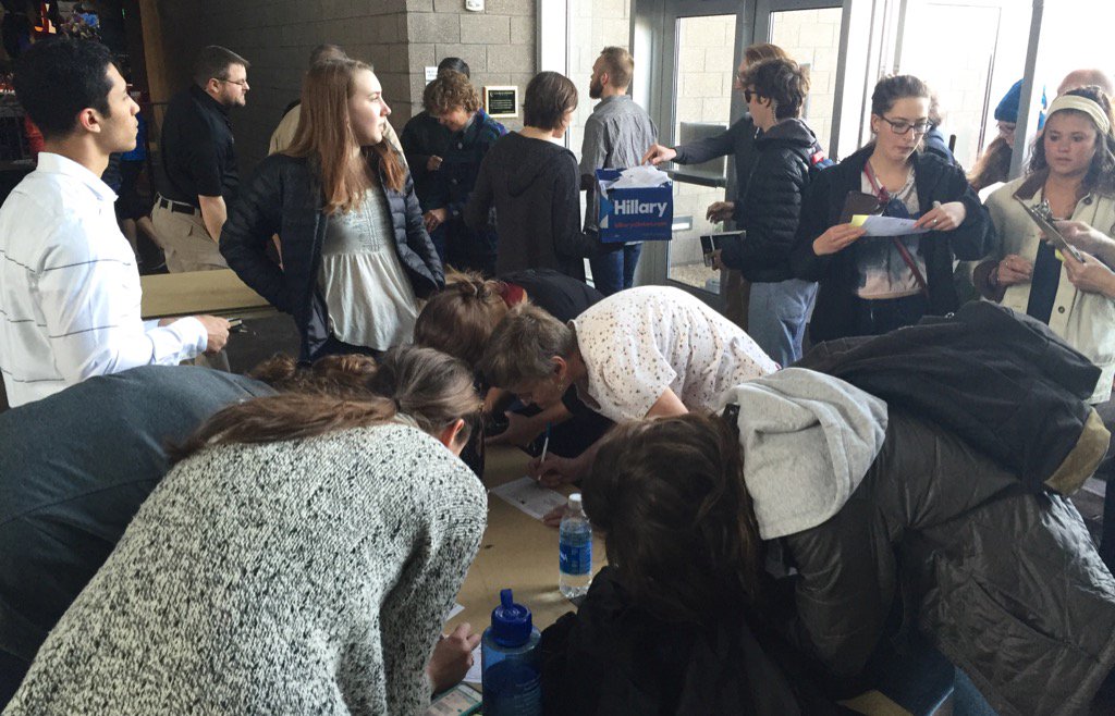 People in line are finding organizers and volunteers and asking to sign commit to caucus cards! #ImWithHer