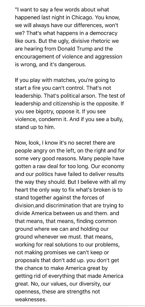 Sat.Mornining March 12 Here is Clinton's full comment on violence at Trump events...
