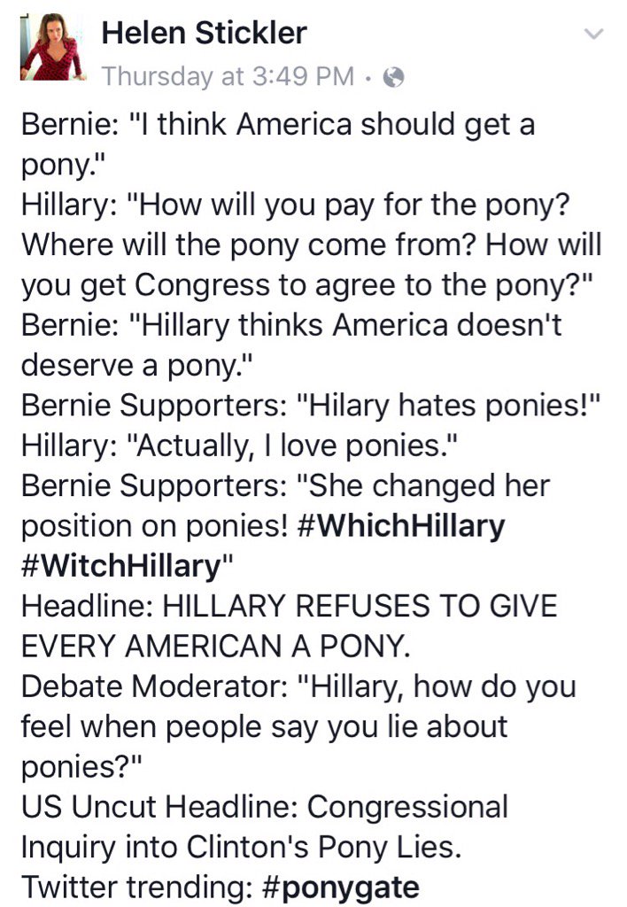But Bernie's SUPPORTERS who have overtaken this discussion board with so much hostility to Hillary that they will repeat any lie from any source and twist any truth in order to take down Hillary (and Bill) are of the same mind as those who produced and wear that button. I no longer believe that any of them will vote for Hillary if she is the nominee. There is too much blind hatred there.