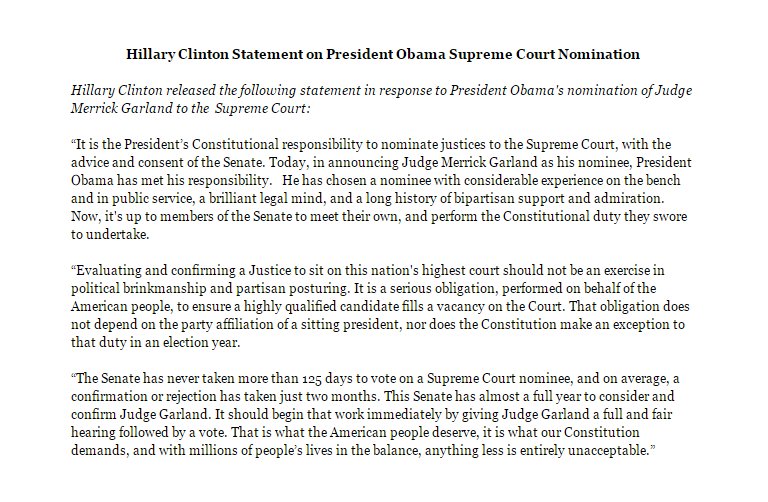 Hillary Clinton on President Obama's nomination of Judge Merrick Garland to SCOTUS (Original Post)