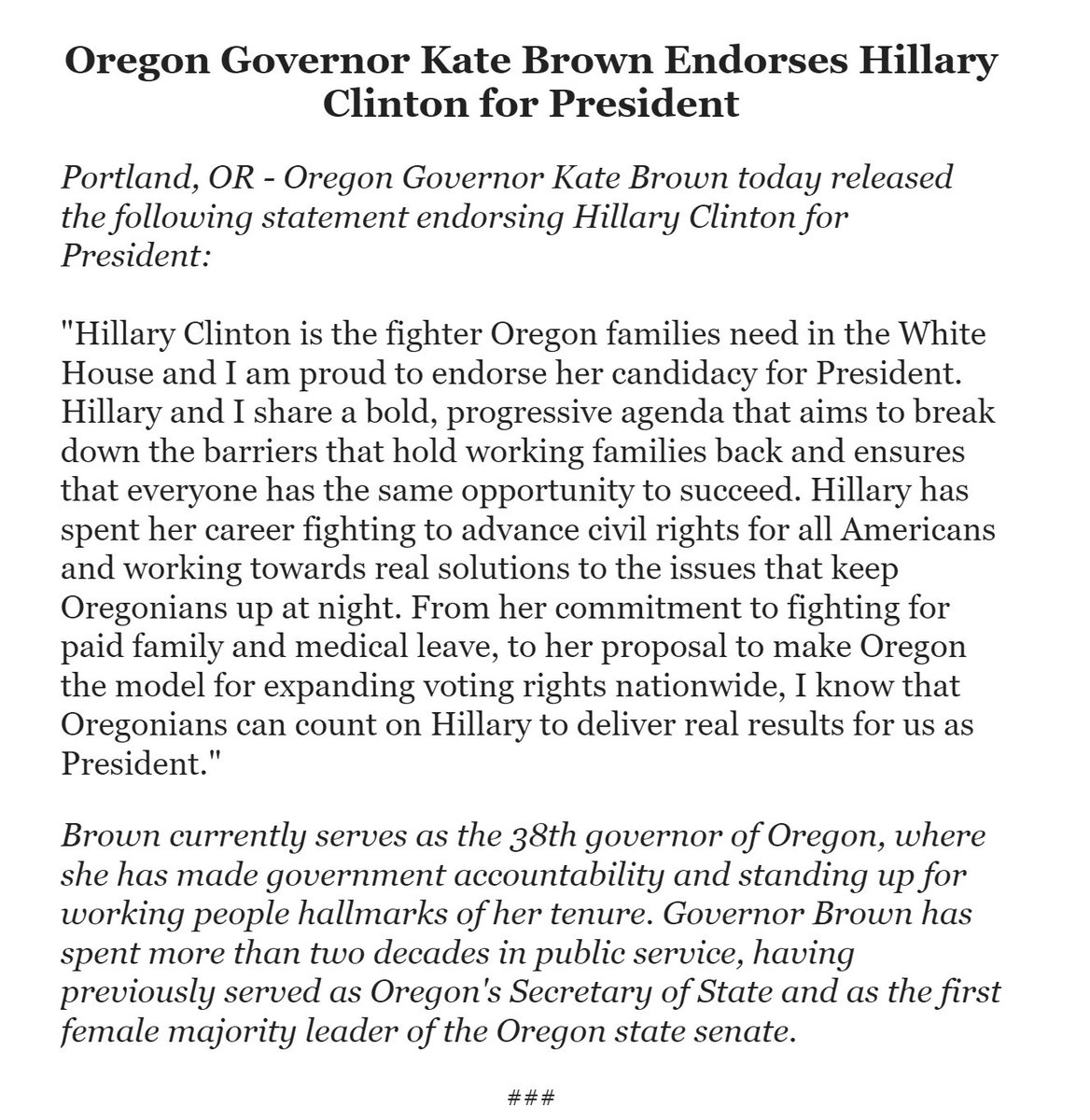 Oregon Goveror Kate Brown Endorses Hillary Clinton for President (Original Post)