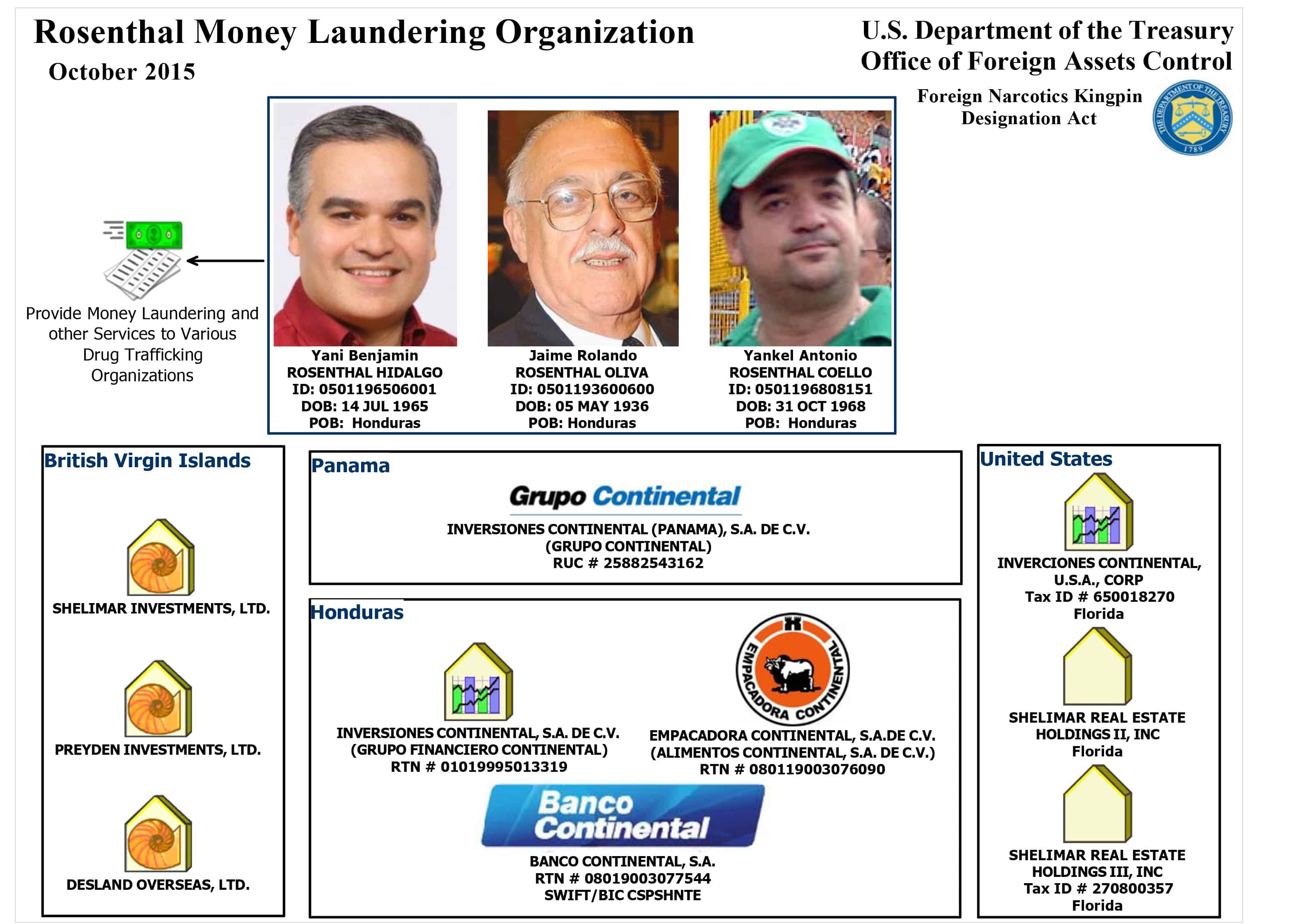 The Rosenthal family controls Grupo Continental, a conglomerate of dozens of companies including Banco Continental, the newspaper El Tiempo and other media, a crocodile farm for leather exports, and sugar, banana, coffee, and cacao companies, among other businesses. Three Rosenthals, including head of the family, Jaime, were linked to money laundering and drug trafficking last year.