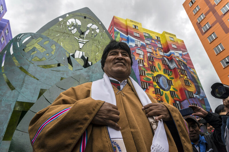 President Evo Morales attended the inauguration of new buildings in a housing project in 2016. The indigenous Aymara artist Roberto Mamani Mamani painted murals over a building facade.