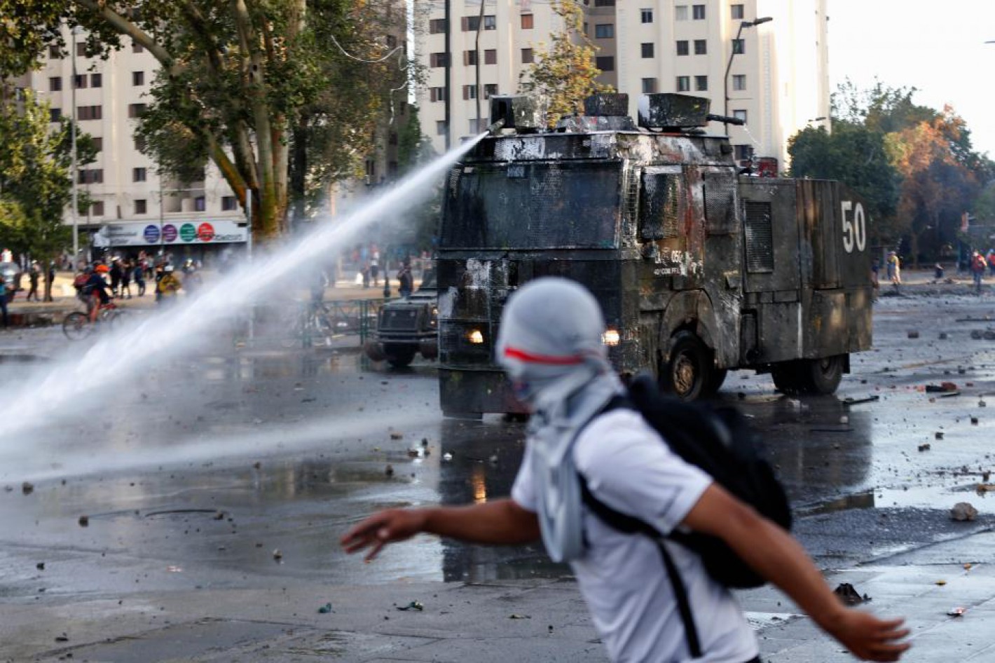 People are sprayed with water by authorities during protests against the government of Sebastián Piñera in Santiago, Chile, on Oct. 30, 2019.(Alberto Valdes / EPA-EFE/REX)