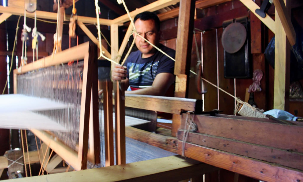 Marciano Vargas Ramírez, extended family member of Khadi Oaxaca co-founder, Eliseo "Cheo" Ramírez, working a pedal loom. Many weavers at Khadi Oaxaca once immigrated to the city or to the U.S. to earn a living. Now they can work from home, together with their families.