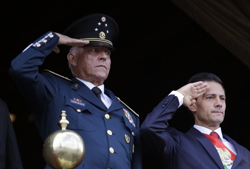 FILE - In this Sept. 16, 2016, file photo, Defense Secretary Gen. Salvador Cienfuegos, left, and Mexico's President Enrique Pena Nieto, salute during the annual Independence Day military parade in Mexico City's main square. On Thursday, Nov. 5, 2020, the former Mexican defense secretary pleaded not guilty to U.S. drug trafficking and money laundering charges during a remote appearance in federal court in New York City. (AP Photo/Rebecca Blackwell, File)