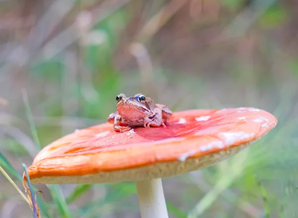 A pumpkin toadlet crawls past a bright orange mushroom, a common feature of the tiny frogs habitat