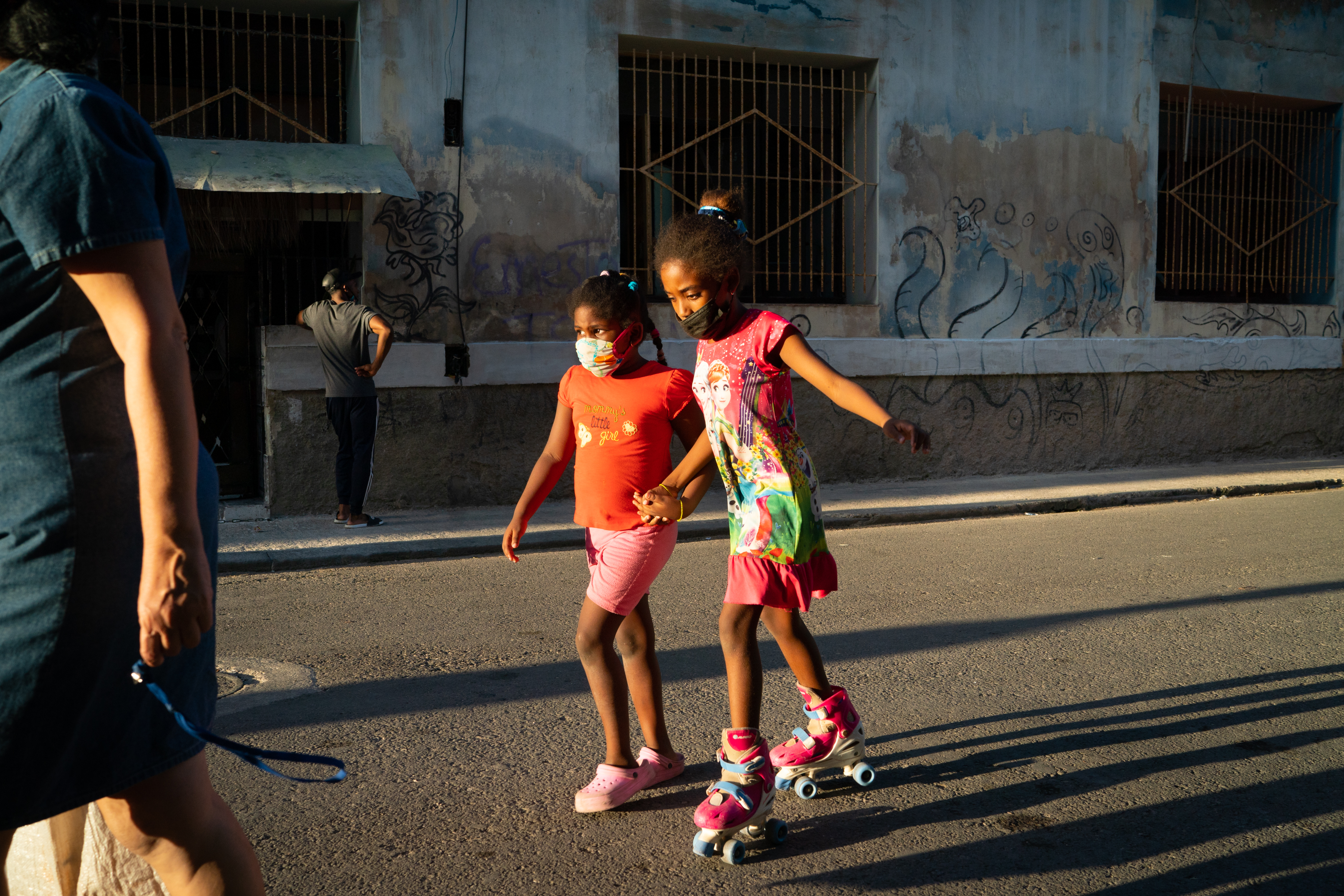 A girl roller-skates alongside her friend in Havana. (Sarah L. Voisin/The Washington Post)