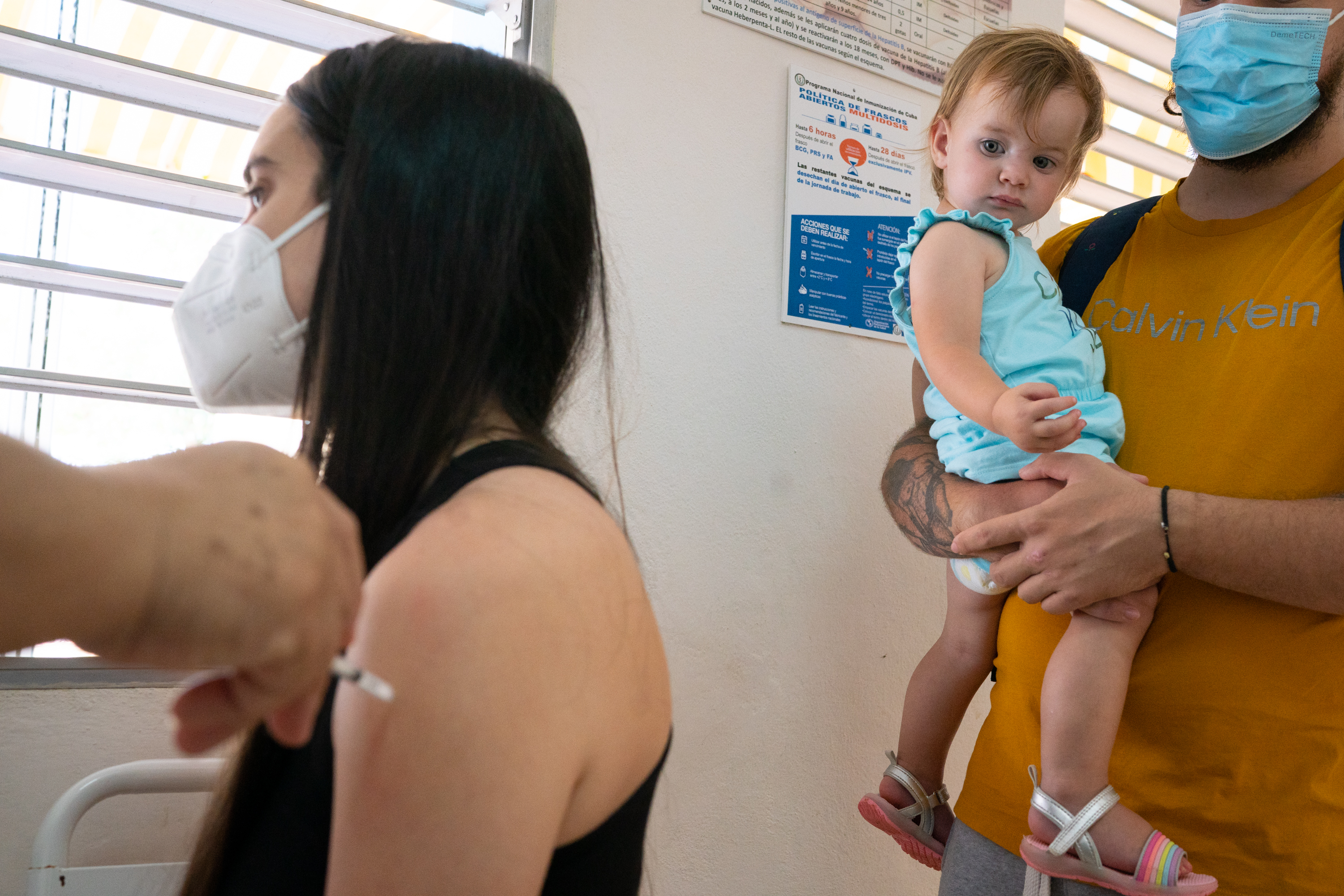 Diana Hernandez, 24, left, gets a follow-up vaccination at a clinic in Playa, the northernmost municipality in Havana, alongside her daughter, Manuelita Sarracino, 15 months, and husband, Juan P. Sarracino, 25, look on. (Sarah L. Voisin/The Washington Post)