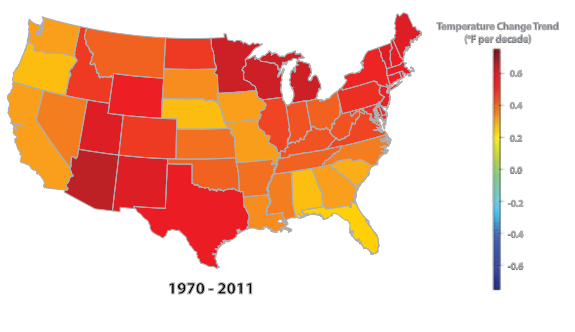 "... Starting in 1970, things changed. The pace of warming accelerated to three times the rate of the century average, and every state showed a warming trend. The top 10 fastest states warmed at an average 0.6 degrees F per decade since 1970, and 17 states warmed faster than a half a degree F per decade since that time.