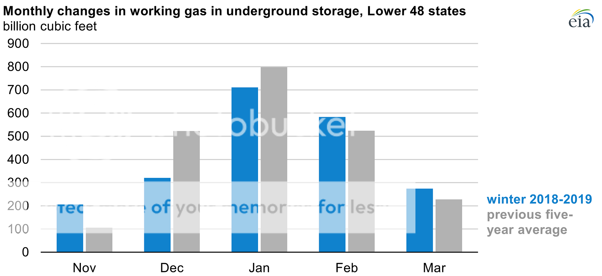 In November 2018, relatively cold weather resulted in 206 Bcf of natural gas withdrawals, almost twice as much as a typical November. However, the pace of withdrawals slowed during December, with a monthly total of 320 Bcf compared with the five-year average of 523 Bcf. Net withdrawals in the remaining months of the 20182019 withdrawal season were within 20% of their typical values.