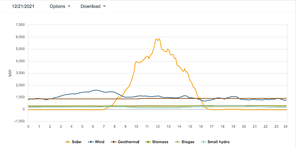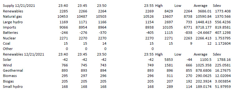 Here's the tailing data of a 24 hour period of five minute increments on the winter solstice a few weeks ago for all energy sources in California during that period:
