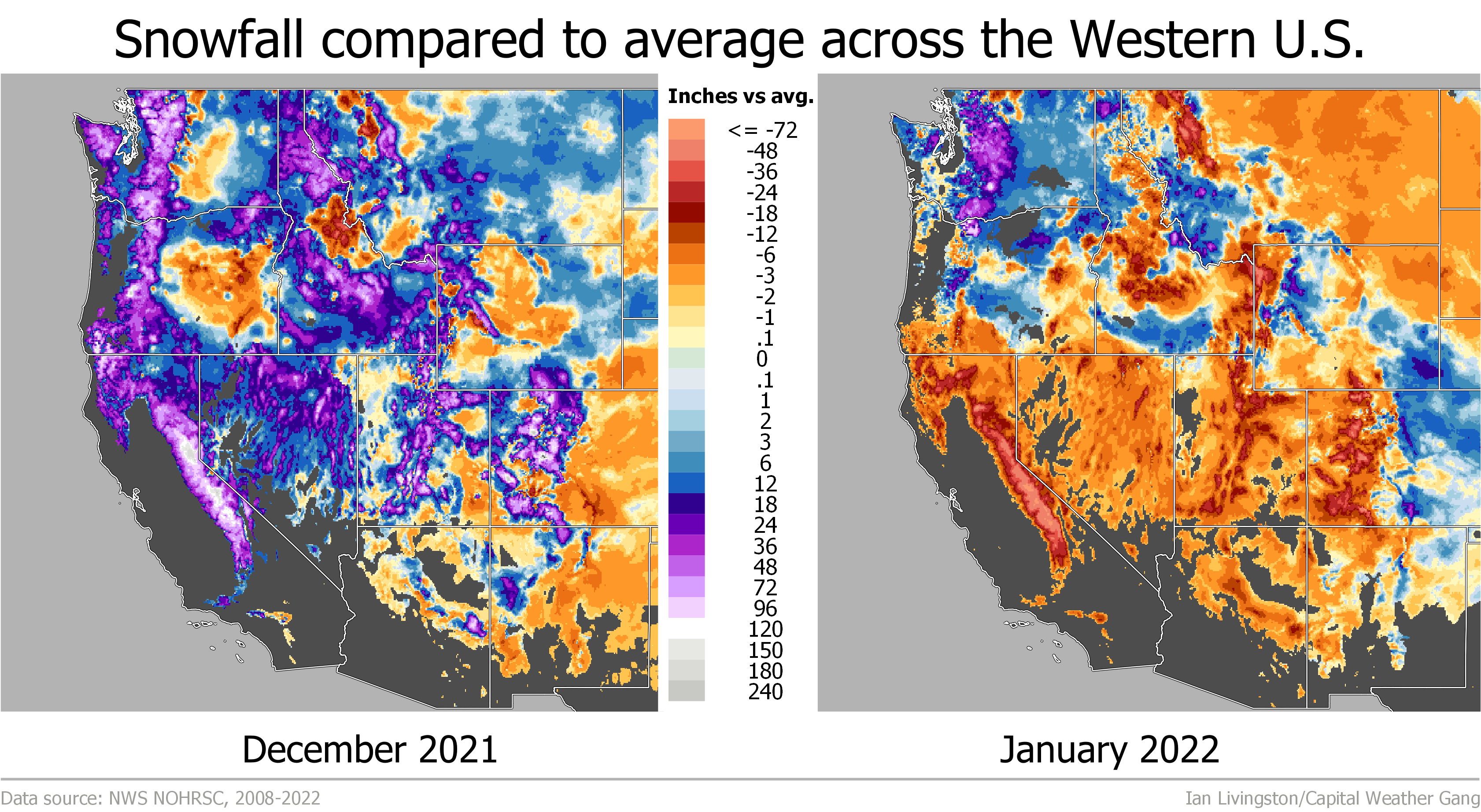 Snowfall accumulation in the Western United States took a sharp downturn from December to January, potentially magnifying drought risk. (Ian Livingston/Capital Weather Gang)