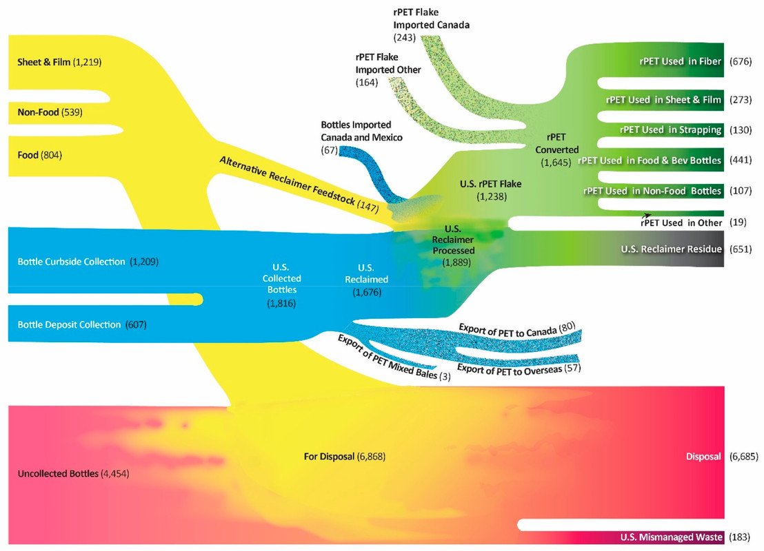 The "Plastic Problem" is a major environmental crisis, among many. We all recycle plastics whenever we can, but the question is what really happens to the recycled material. A Sankey diagram of the material flows of PET can be found in the following publication: Recycling of Plastics in the United States: Plastic Material Flows and Polyethylene Terephthalate (PET) Recycling Processes Raymond L. Smith, Sudhakar Takkellapati, and Rachelle C. Riegerix ACS Sustainable Chemistry & Engineering 2022 10 (6), 2084-2096.