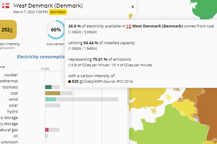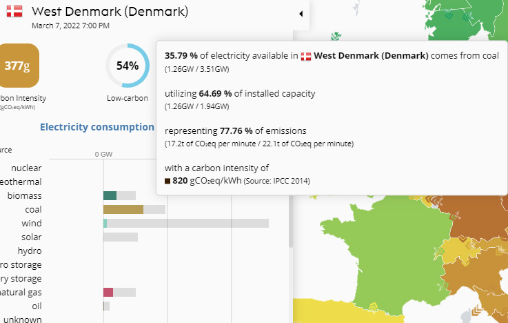 As I was writing this post, the wind seems to have died down, with Danish wind capacity utilization falling to 2.17%, and the carbon intensity of West Denmark has risen to 377 g CO2/kwh.