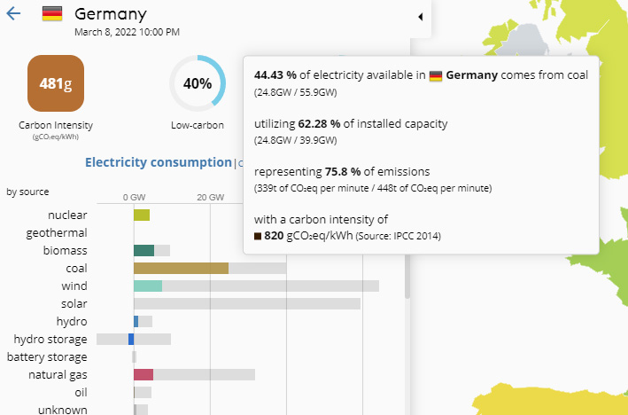 Electricity Map, Germany (Accessed 3/3/23, 1:46 Berlin time, 3/2/23, US 7:46 EST)