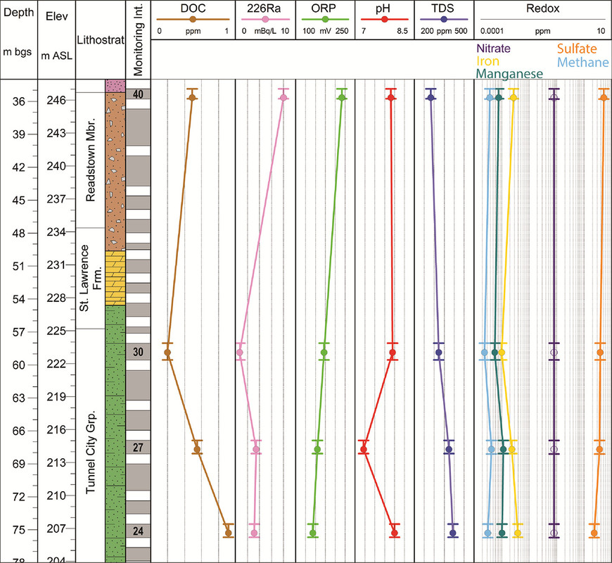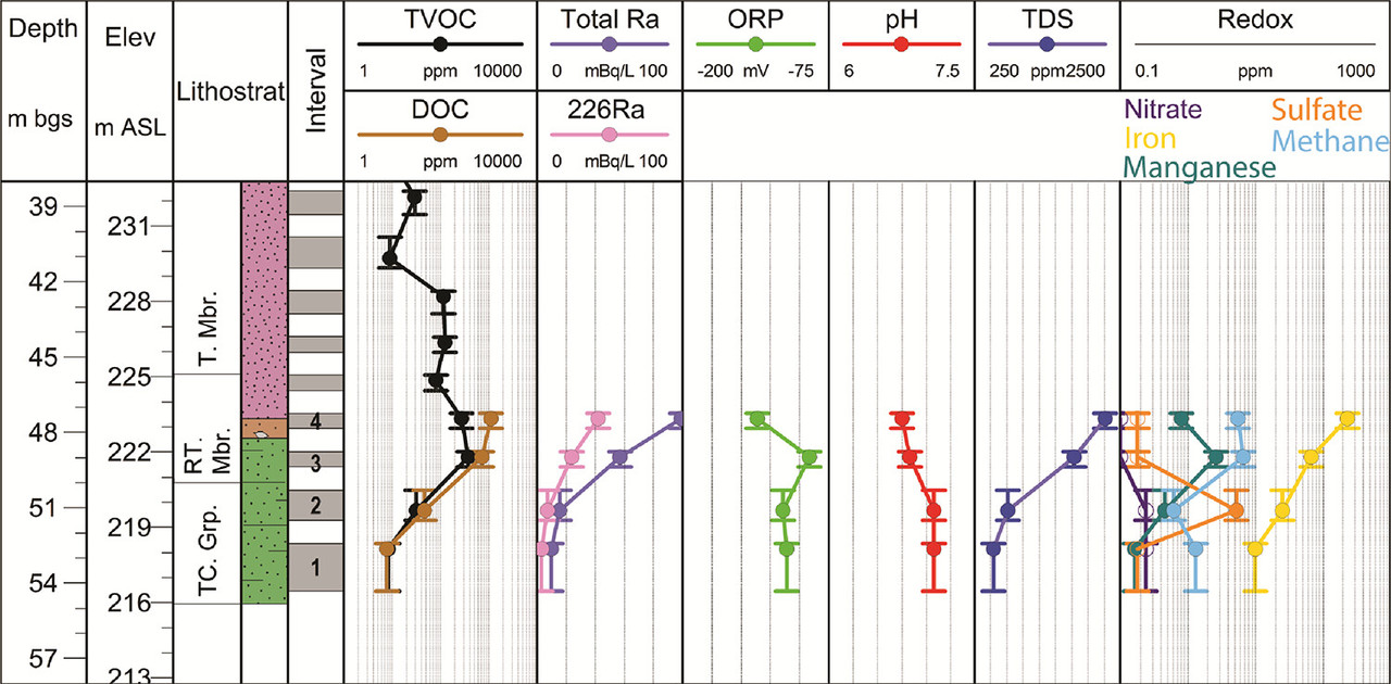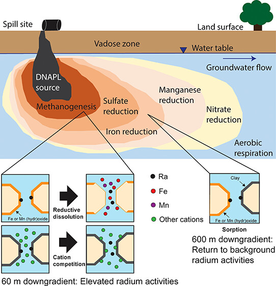 The spill of organic chemicals that reaches the subsurface is another example of anthropogenic influence on aquifer geochemical conditions that could potentially impact Ra occurrence in groundwater. This study evaluates Ra (226Ra + 228Ra) and parent nuclide (e.g., 238U) occurrence in a sandstone aquifer contaminated with a mixture of chlorinated solvents, ketones, and aromatics occurring as a dense non-aqueous phase liquid (DNAPL) in the source zone. The objectives of this study are to (1) compare Ra occurrence within the influence of contamination relative to a background reference location, (2) identify geochemical conditions associated with elevated Ra activity within the influence of contamination, and (3) evaluate potential Ra attenuation mechanisms within the dissolved phase contaminant plume. A network of high-resolution multi-level monitoring systems is used to compare Ra activities in groundwater at three locations: (1) directly downgradient, but not in the DNAPL source zone, (2) near the middle of the dissolved phase hydrocarbon plume, and (3) a background location outside the influence of hydrocarbon contamination. (38) Measured aqueous parameters used to assess 226Ra activities in relation to geochemical conditions induced by organic contaminant occurrence and biodegradation include redox parameters (e.g., nitrate, sulfate, Fe, Mn), TDS, and pH. Geochemical modeling is applied to evaluate Ra sequestration mechanisms within the dissolved phase plume (e.g., co-precipitation, sorption). Overall, this study assesses the potential for the release of naturally occurring Ra from aquifer sediments at hydrocarbon-impacted sites and highlights the importance of characterizing trace elements to achieve a holistic assessment of the potential health and environmental impacts at such sites...