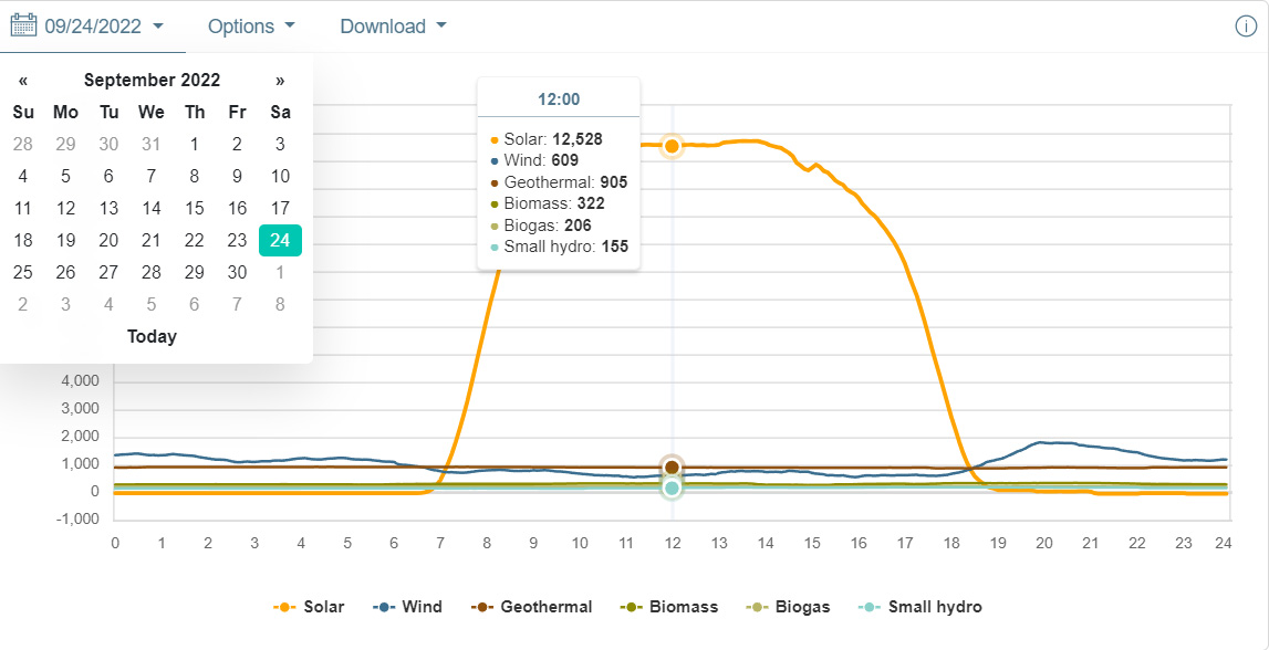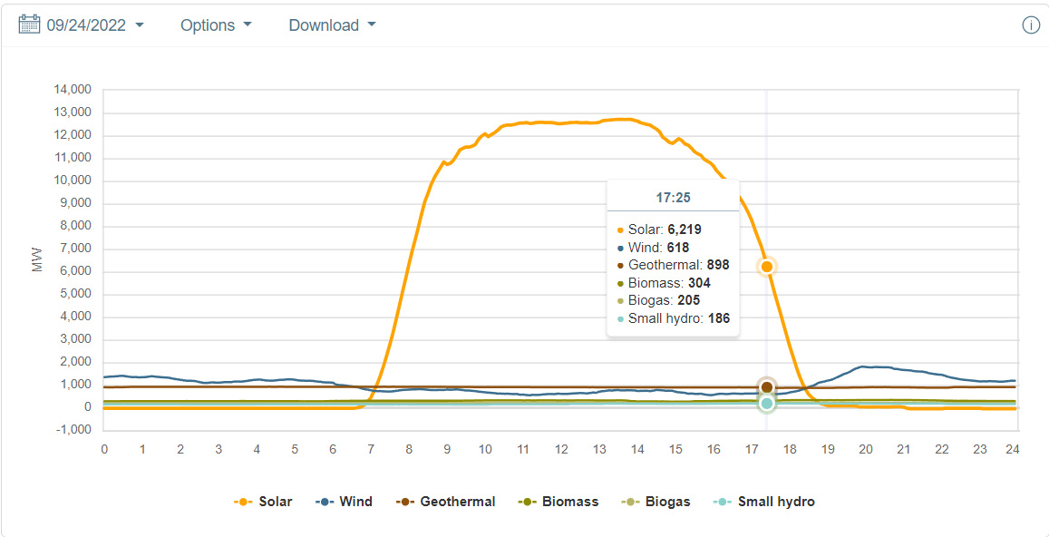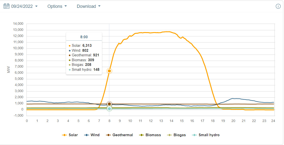 Many times, particularly on cloudless days, solar output has a (mildly) Gaussian aspect. Near the most recent Equinox in California, (CAISO) that of this past March, there seems to have been clouds and or rain drifting in around this time, and the autumn equinox was also a little bit noisy, so I selected 9/24/2022, near the autumn equinox for the following graphics showing near the peak, the rough 1/2 height in the morning, in this case 8:00 am and the afternoon half-height, 19:25: