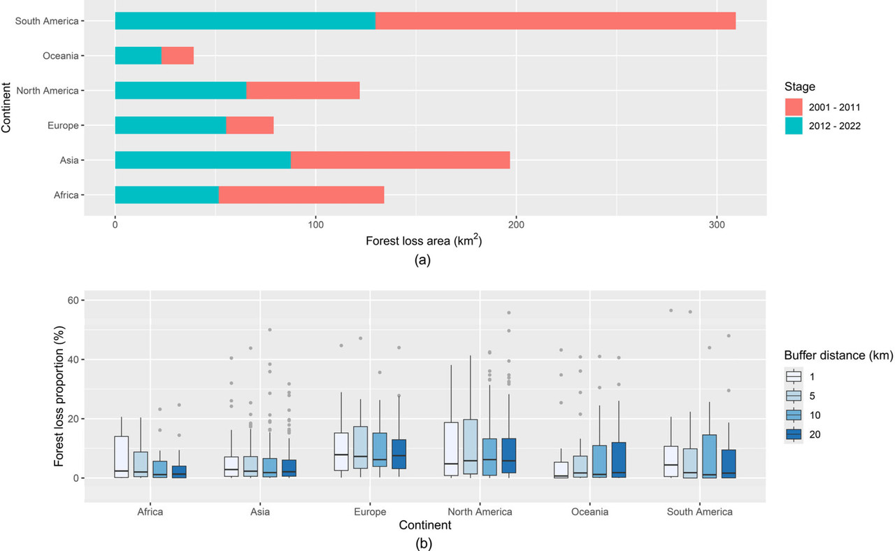 Figure 1. Forest loss caused by mining activities. (a) Forest loss in mining areas in different stages. (b) Forest loss proportions in different mining buffers.