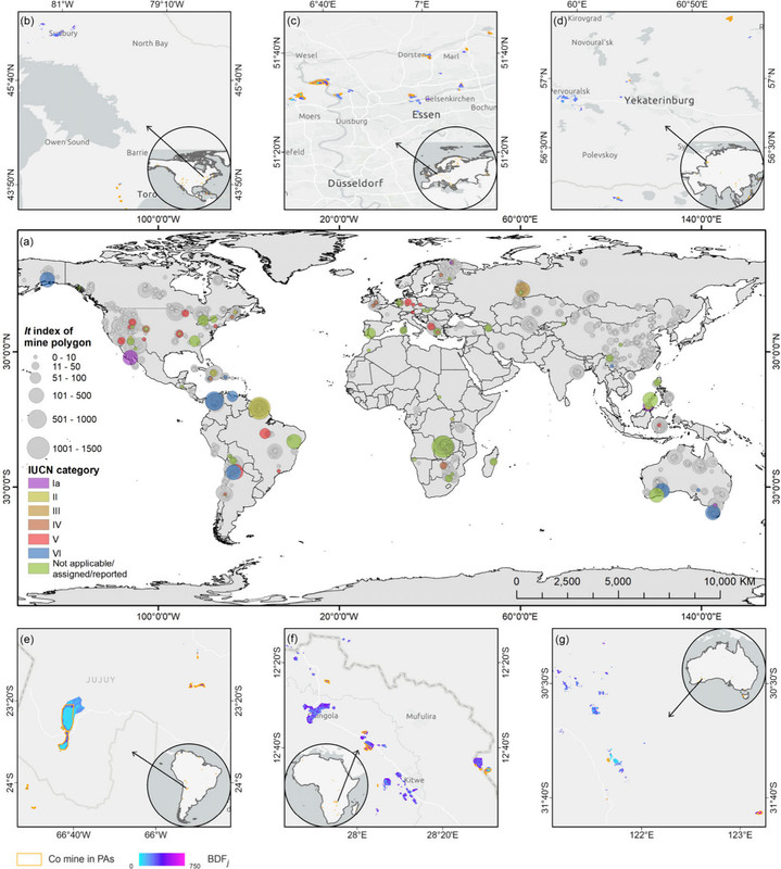 Figure 3. Biodiversity disturbance from mining activities measured byIt index. (a) The It index of the intersection regions of mines and PAs (multicolor circles) as well as mines and non-PAs (gray circles), respectively. International Union for Conservation of Nature (IUCN) standard (Table S2) has divided the protected area into I–V categories according to their decreasing importance of protection. (b–g) The BDFj in mines of various continents. BDFj denotes the mining pressure on biodiversity in each pixel.