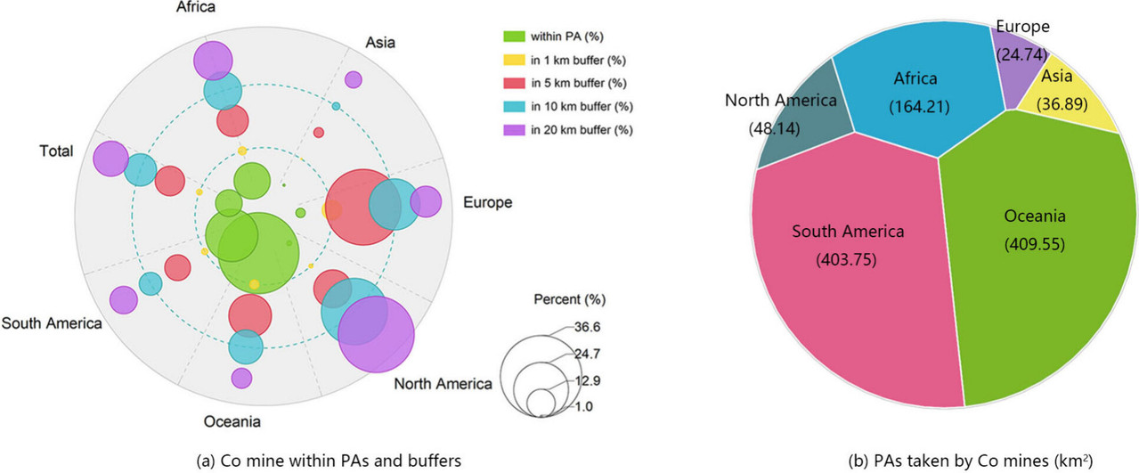 Figure 2. Cobalt-related mines in protected areas. (a) Mine proportions within PAs and their buffers. (b) PA areas taken by mines (km2).