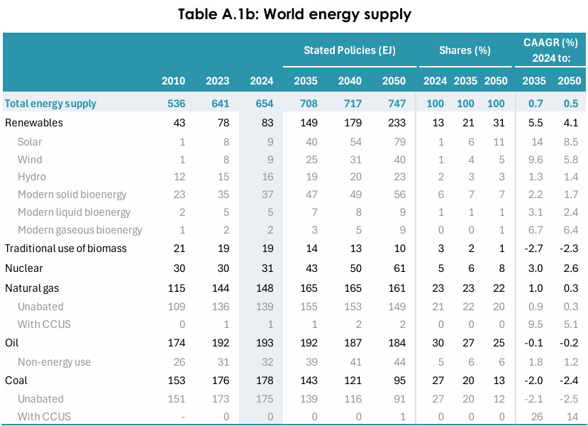 Here, from the most recent edition, is the figures, in Exajoules, for the primary energy produced from each energy source in the most recent edition World Energy Outlook 2025: