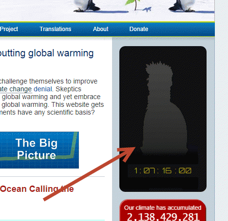 ...All of the silhouettes are greyed out now, but one can rest assured they be filled in with cartoonish caricatures once the countdown clock on the lower right reaches zero. My guess? John Cook has likely put his failed cartooning talents back to work again. Given the juvenile fascination former cartoonist turned amateur psychologist and numbers bookie for the 97% John Cook has with smearing climate skeptics, this will reveal itself as some sort of interactive name and shame application for the top 100 climate skeptics worldwide.