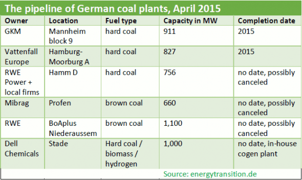Two weeks after the BDEW updated the list above, Mibrag announced that it was stepping away (report in German) from the Profen project entirely. A fourth project, Hamm D, should already be online, but various acids entered the boiler, and the plant has been delayed indefinitely. The latest word (report in German) is that the plant may never generate electricity because German utilities began building too many plants 10 years ago.
