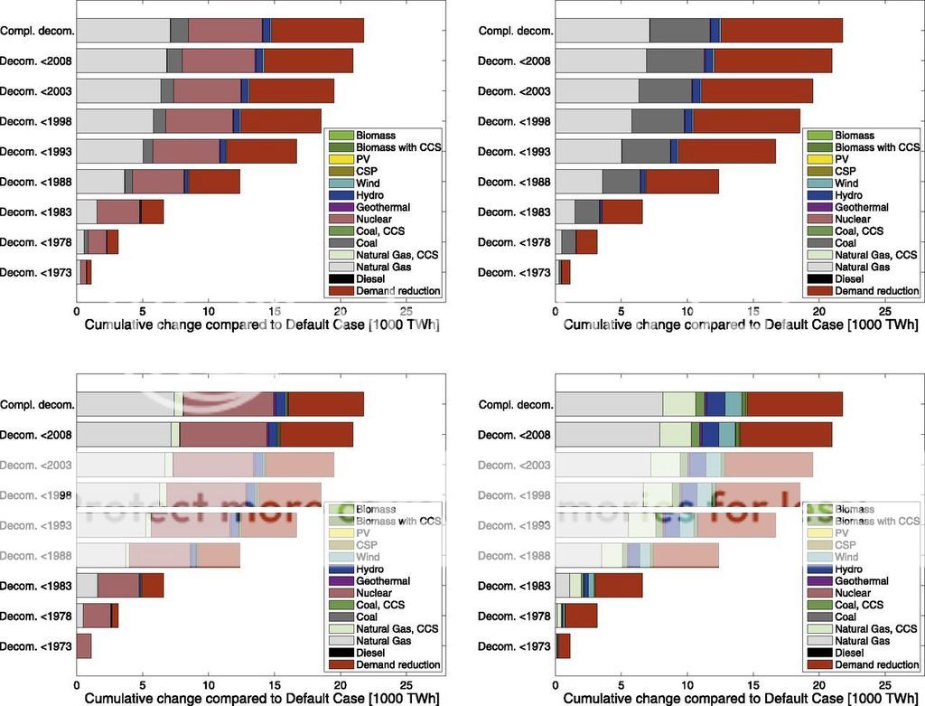 Differential impact of decommissioning on the global electricity sector measured by changes of cumulative electricity generation from 2010 to 2020. The reference case is always without decommissioning. Upper: No carbon budget. Lower: Carbon budget imposed. Left: Scenarios in which investment in new nuclear power plants are feasible. Right: Cases without investments in new nuclear capacity. Within each of the four graphs, the bottom stacked bar shows the case of only the oldest vintage (i.e., everything built before 1973) being decommissioned. The next stacked bar above the bottom bar shows the result when the second-oldest vintage was also decommissioned, and so forth, up to the top bar, which represents the case of full decommissioning. The sum of the stacked bars represents the shortfall of cumulative electricity production over the period of 2010 to 2020. The components show how the shortfall is compensated by alternative technologies, including demand reduction.