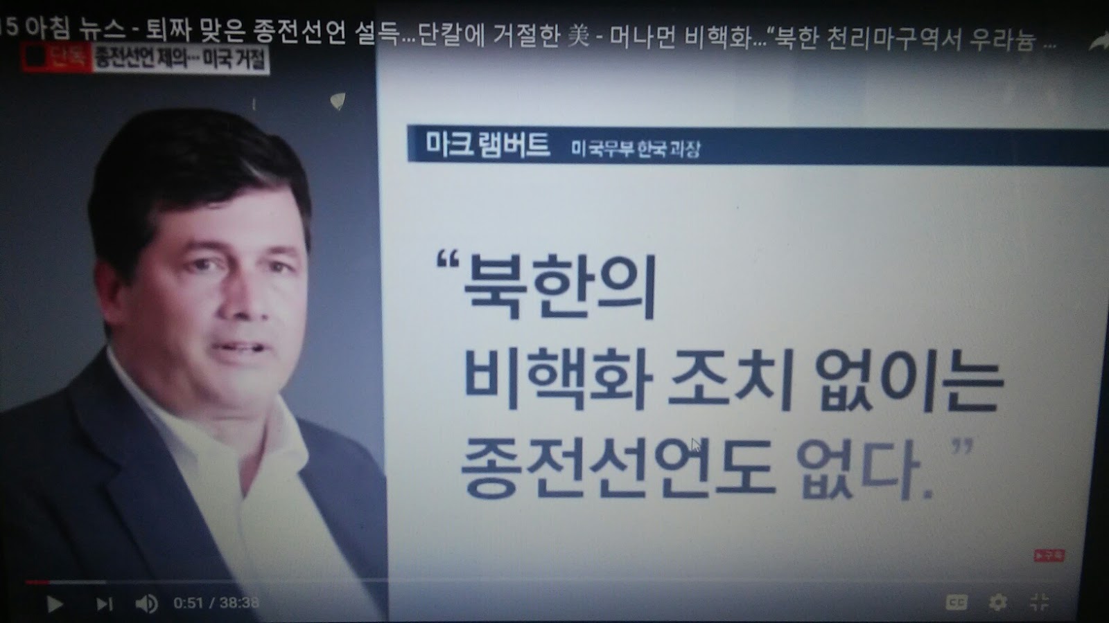 The most recent South Korean news reports, July 14, and 15, confirmed that the US side, at the Pyongyang meeting, would not accept the North Korean proposal for an announcement in the near future of the end of the Korean conflict, not until measures are taken to denuclearize by North Korea. The US negotiating position was confirmed by a US State Department official, Mark Lambert, Korea section chief, in a Channel A news video clip shown above.