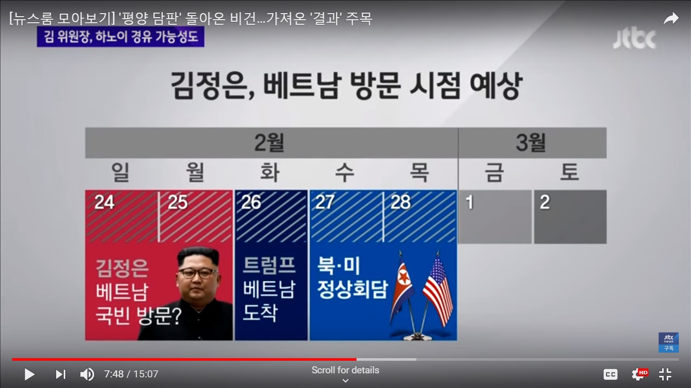 (Source- JTBC News 02.08) Kim Jong Un stopover in Hanoi possible. Projected period for Kim to visit Vietnam. Will there be an official state visit by Kim during the 24-25 period? Trump arrives on the 26th. Talks are projected for the 27th and 28th.