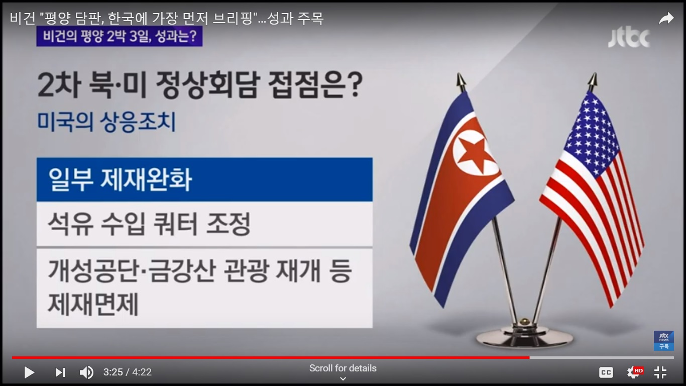 (Source- JTBC News 02.08) Beigun is back from Pyongyang. Attention is on the results of the meeting. South Korea will be briefed first tomorrow. What are the points of agreement for the second summit? Reciprocal US measures? Suggested are partial easing of sanctions, specifically some easing on the quota for fuel sanctions and granting a sanctions waiver for reopening Kumgangsan resort and Kaesong industrial zone, joint Korean projects.