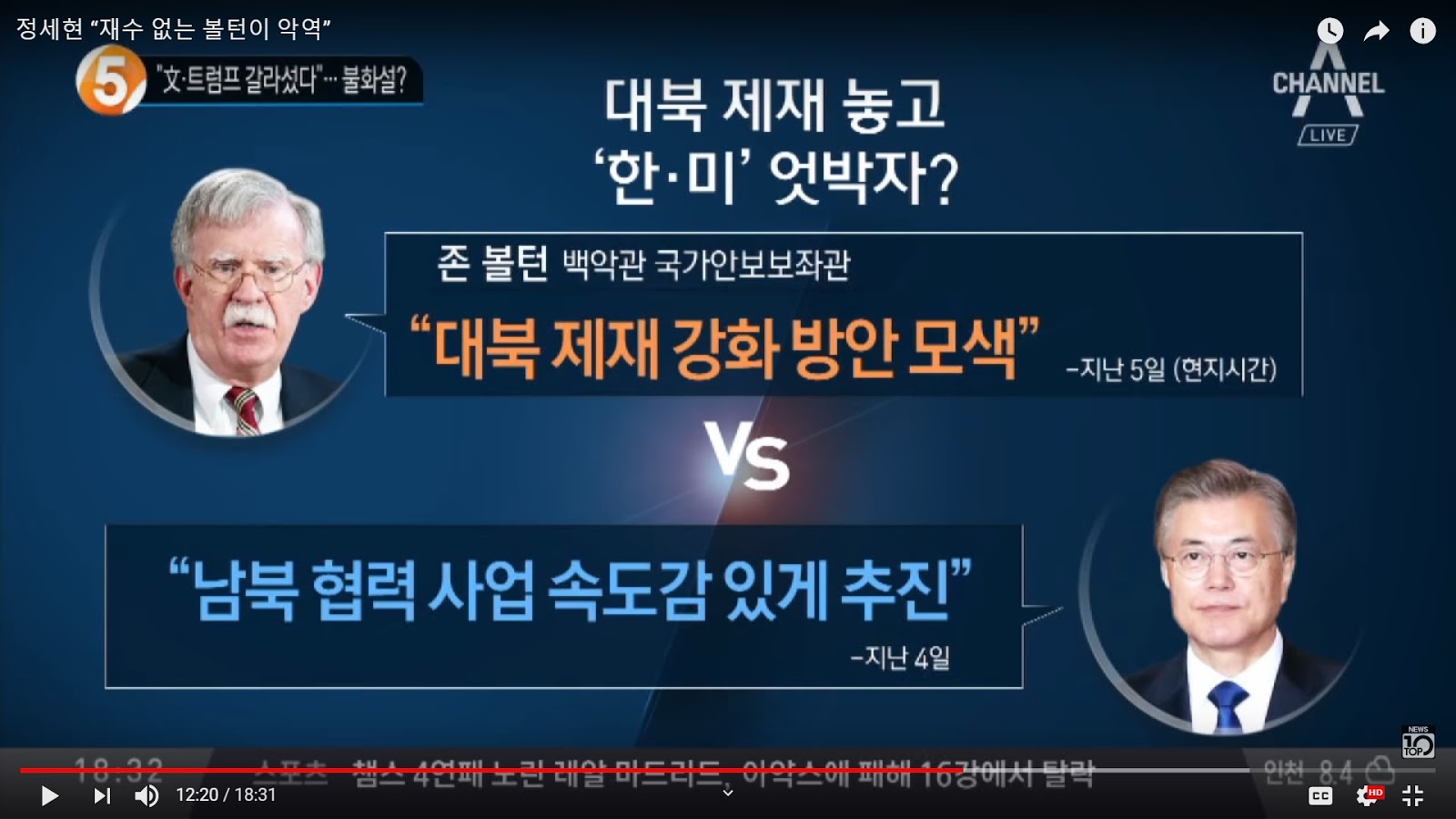 (Source- Channel A News Top Ten, 3.7) 5. Trump-Moon split- trouble? Lessen North Korean sanctions- ROK-US out of step? Bolton- I'm looking for ways to strengthen sanctions against North Korea. (March 5) Moon- Advance the speed of North South cooperative enterprises. (March 4.)