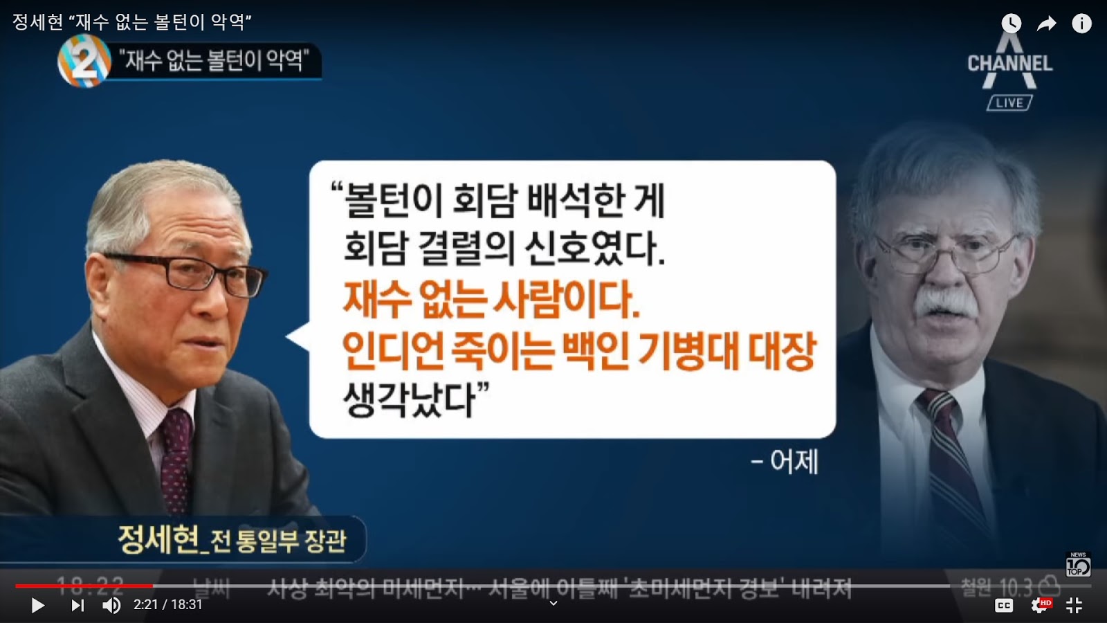 (Source- Channel A News Top Ten, 3.7) Jong Se Hyun- "Ill fated Bolton villain." "Bolton's participation in the summit dialogue signaled its collapse. He is (an unwanted) ill fated person. The thought of an Indian killing white cavalry general comes to mind."