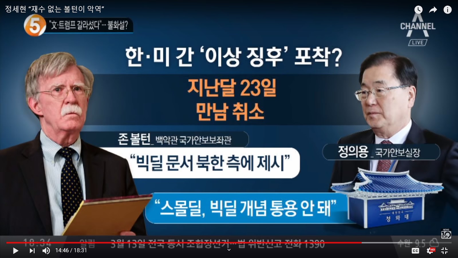 (Source- Channel A News Top Ten, 3.7) Strange signal detected between the US and South Korea? February 23 (security advisers) meeting cancelled. Bolton- I have a "big deal" document to present to the North. Jong Eui Yong- Small deal, a big deal concept won't work.
