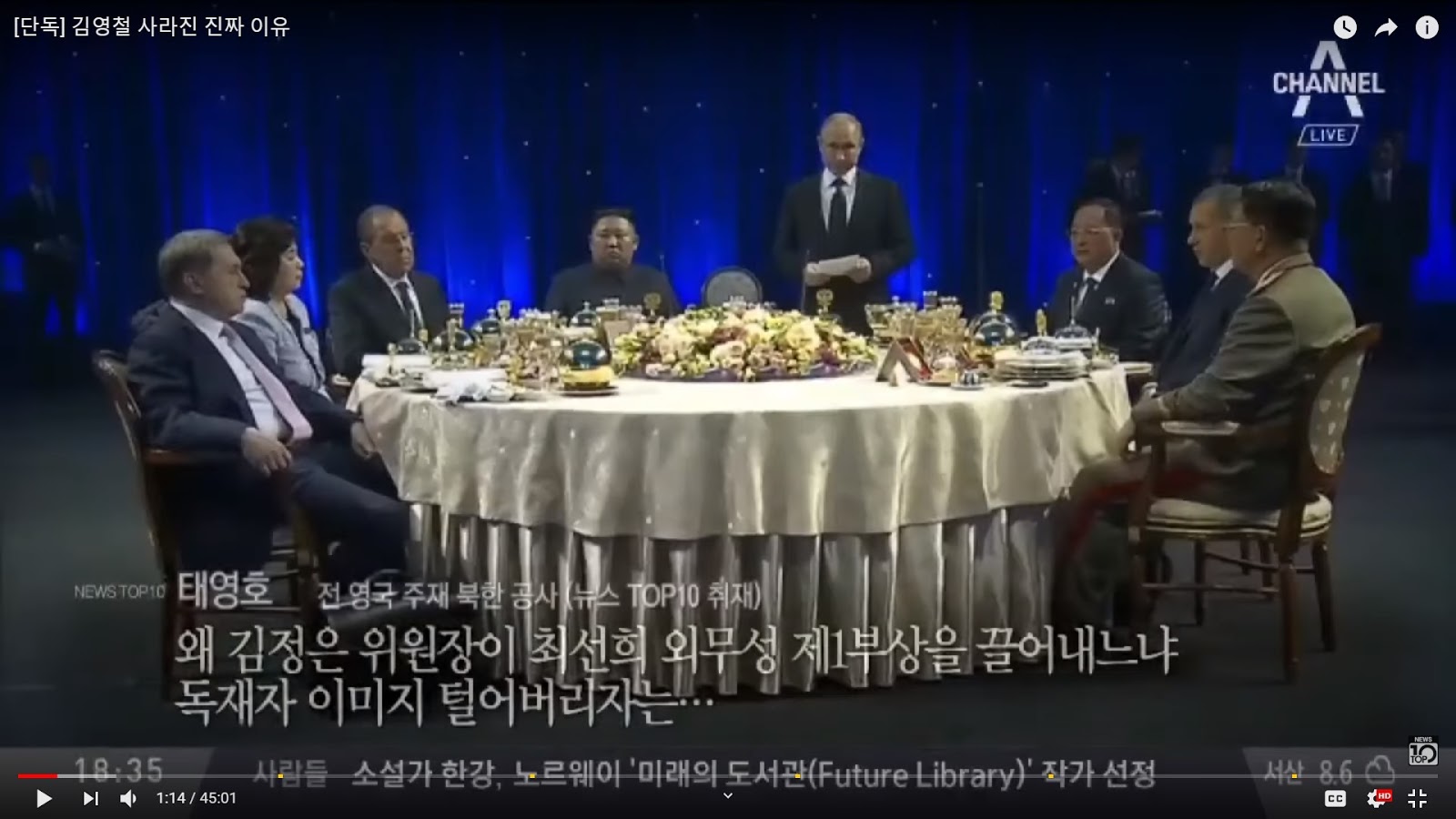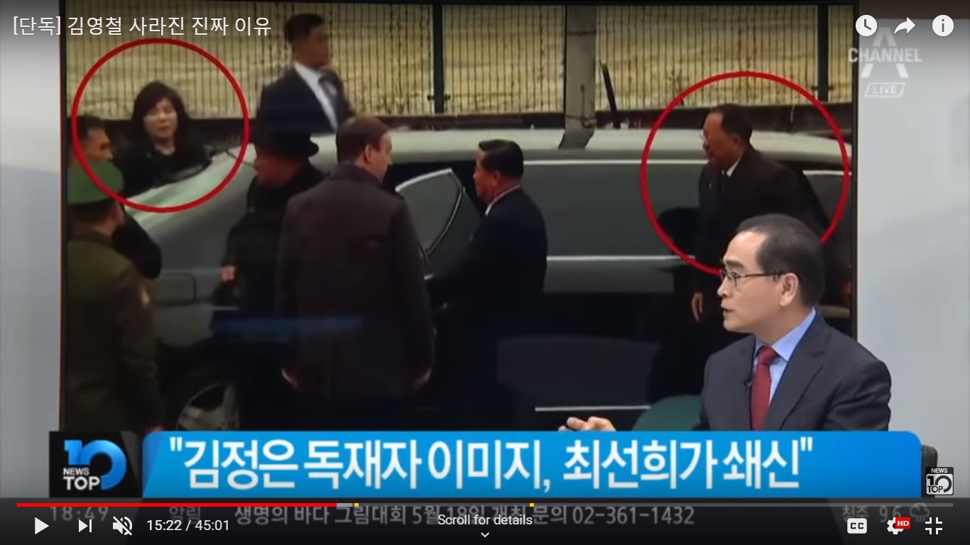 (Source- Channel A News 4.26) Choe Son Hui (left circle) arrives in the same limo with Kim Jong Un at the Vladivostok venue for the summit. Her nominal boss, Foreign Minister Ri Yong Ho, (right circle) apparently rode in the front, while Choe sat in the rear with Kim Jong Un. The streamer says Choi Son Hui reforms Kim Jong Un's dictator image, paraphrasing Thae Yong Ho, expert guest. Thae is a former diplomat who defected from the DPRK embassy in London to South Korea. He had a one on one interview with the host of the Channel A News Top Ten program on April 26 to evaluate developments connected with the Kim-Putin summit.