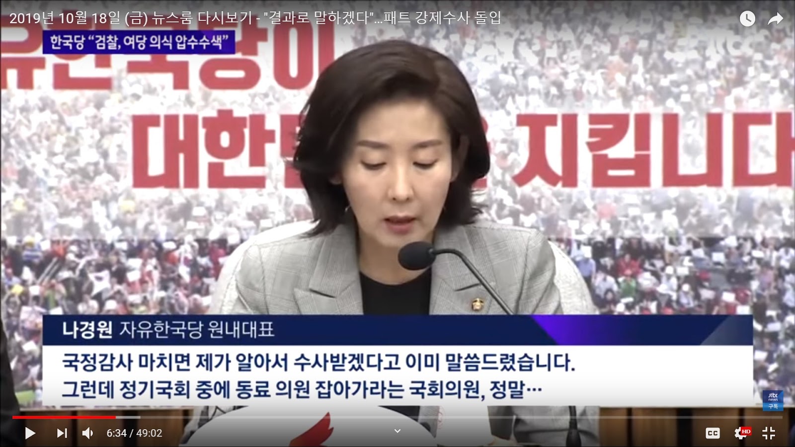 (Source- JTBC News 10.18) Liberty Korea Party opposition leader Na Kyung Won in the National Assembly, "I have already said I know that in order for government to finish its (fast track) investigation we will face investigation. Nevertheless, during the regular session of the National Assembly to take colleagues away (from our duties) really..."