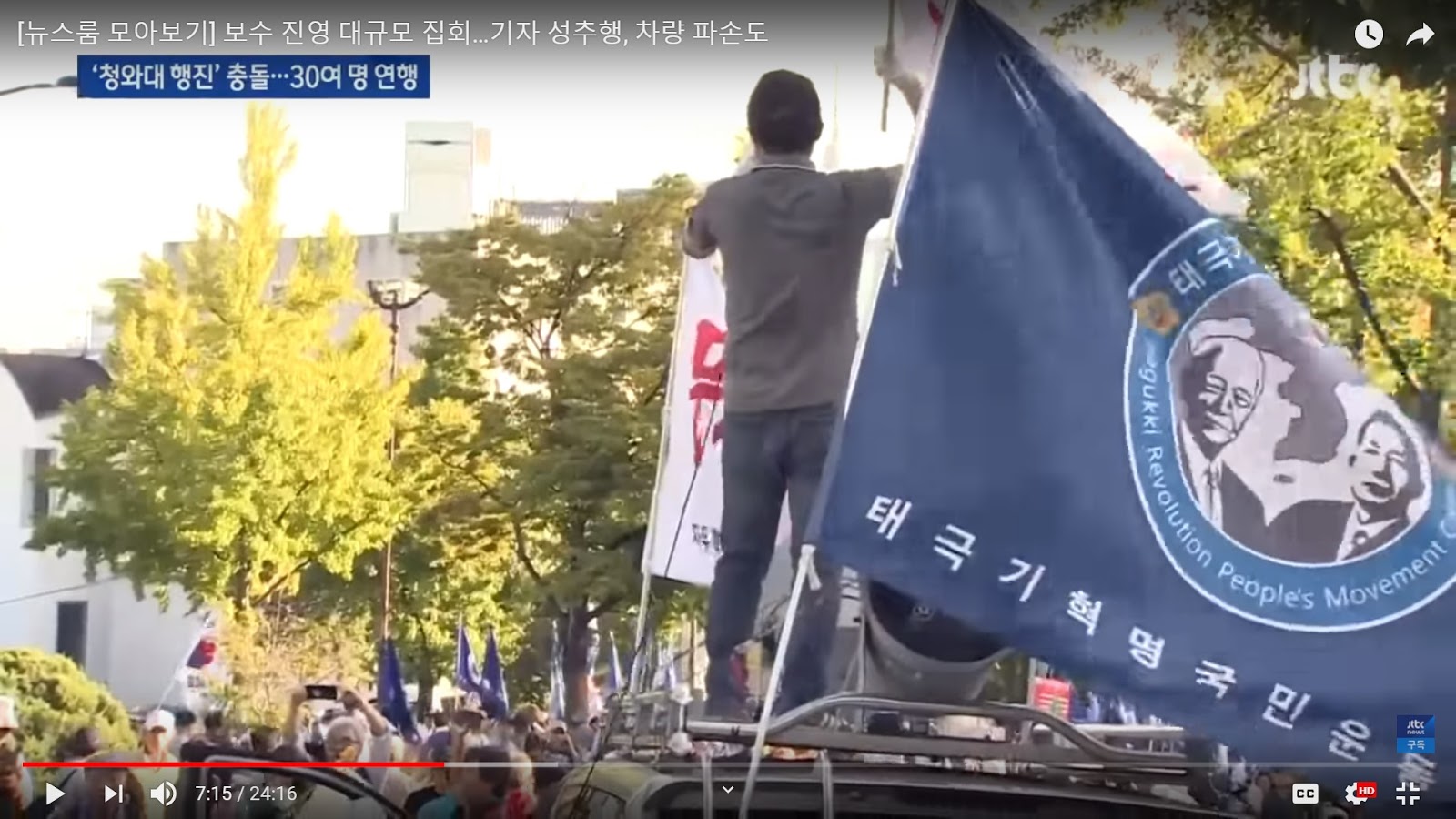 (Source- JTBC News, 10.3) The Taegukki People's Revolution Movement, a reactionary far right organization, appeared to be present at the demonstration in force, carrying US flags as well as South Korean flags. Their banner (above) featured the former ruthless dictators Syngman Rhee and Park Chung Hee.