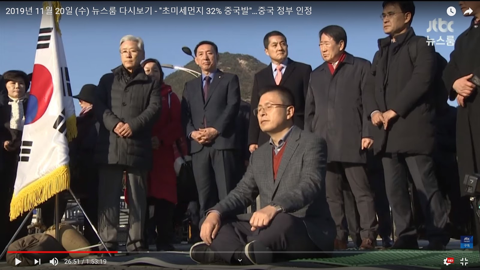 Just over a month ago, in a commentary titled Political Turmoil in South Korea, I asked, "...So what will the wily LKP leaders come up with for their next move? More mass street demonstrations? Attempts by demonstrators to enter the Blue House? Violent Black Bloc type tactics seen in Hong Kong presaged in the October 3 Gwangwhamun demonstration? Anything could happen." Well now we have it. Right wing Liberty Party Korea leader, Hwang Kyo-ahn, has gone on a "hunger strike," the South Korean news media reported yesterday. This is a further variation on Hwang's holier than thou pose as an ascetic when he shaved his head as a protest against the suspected corruption of then Justice Minister Cho Kuk. That particular cause, after Cho's resignation, seems to have exhausted itself in light of the accusations against LKP floor leader in the Assembly, Na Kyung-won. Now, Hwang says he's "determined to die" as part of his sit-in hunger strike. His hunger strike started at 2:00 pm local time in Seoul according to JTBC.