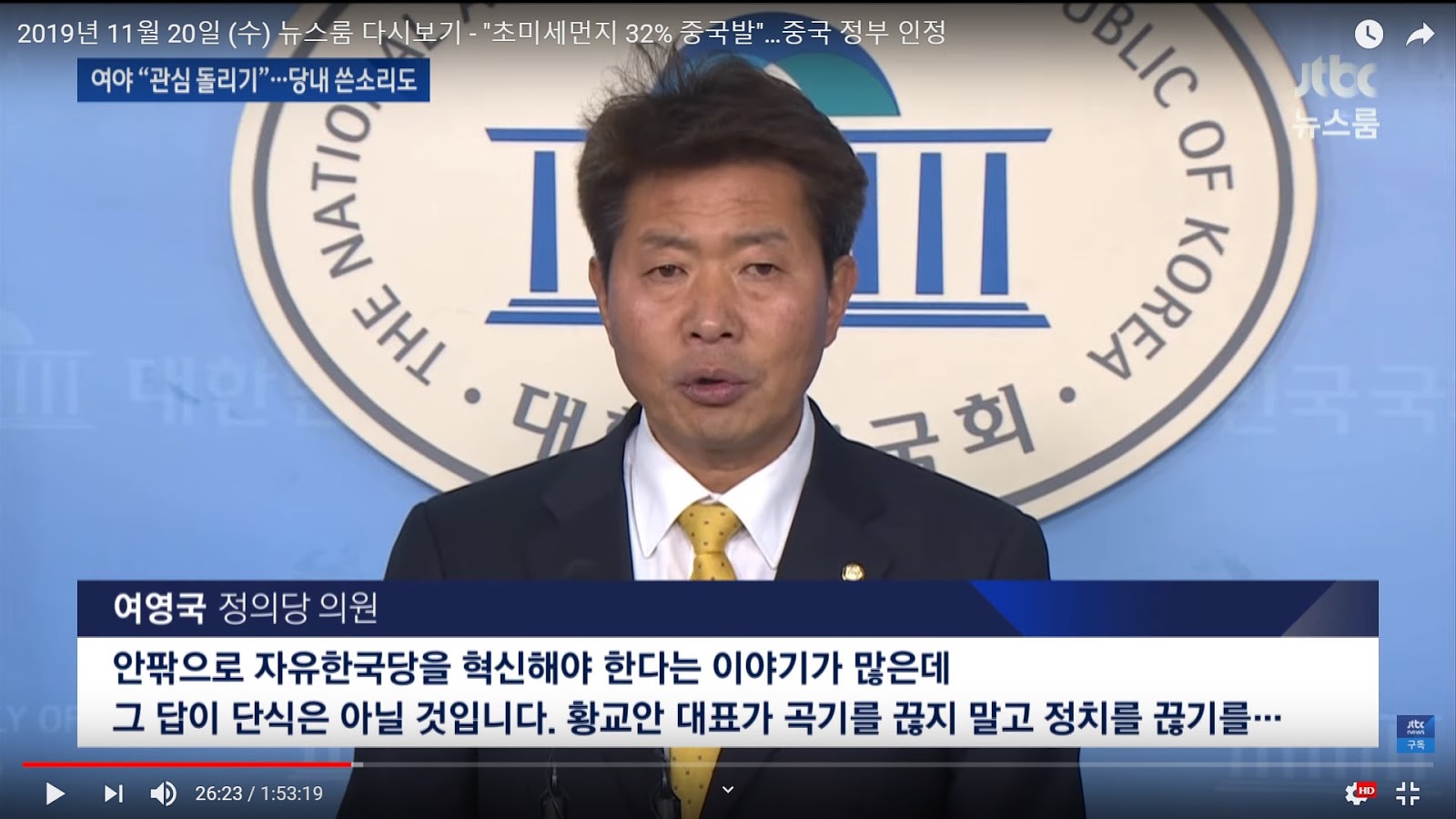 (Source- JTBC News, 11.20) Reo Yeong-kuk, Justice Party, "While there is much talk inside and outside that the LKP must reform, the answer will not be a hunger strike; rather than cutting off food, he should cut off politics."