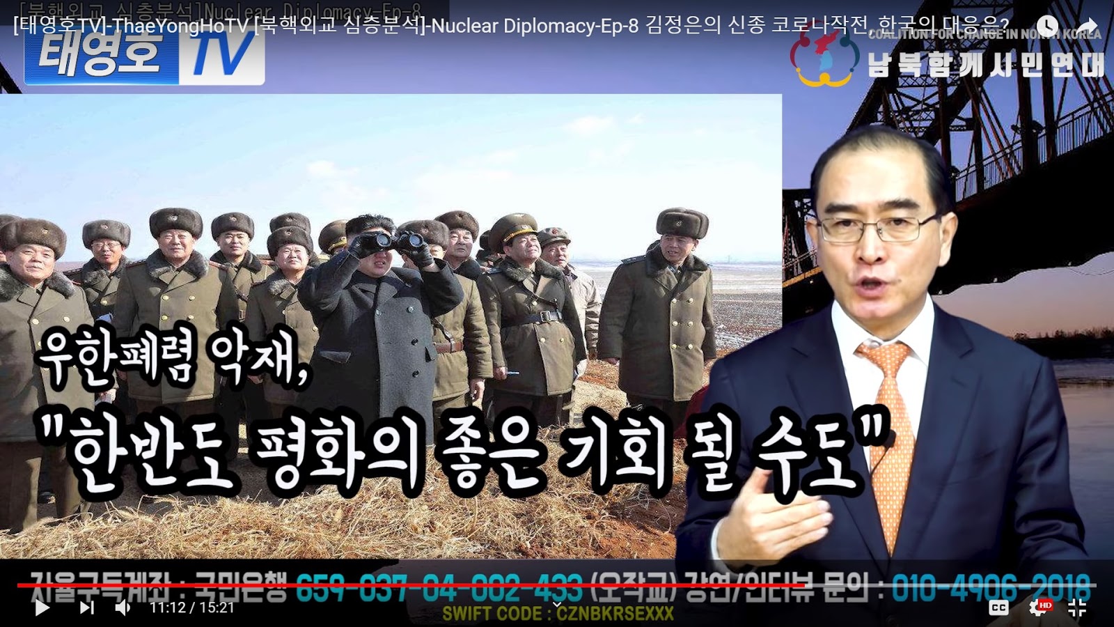(Source - [태영호TV]-ThaeYongHoTV [북핵외교 심층분석]-Nuclear Diplomacy-Ep-8 김정은의 신종 코로나작전, 한국의 대응은? 2.3.10) The unfavorable Wuhan virus, "but a good opportunity for peace on the Korean peninsula is also possible."
