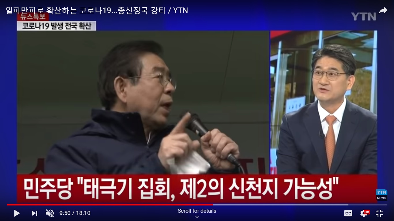 In related news, Son Hak-kyu, representative of the center-right bareun mirae party, called for consideration of postponement of April 15 general elections due to the epidemic. At the same time far right groups ignore the new public health ban on assemblies of persons in public plazas in Seoul. At present the Blue House is not considering postponement of the general election. According to the YTN broadcast, such a postponement, by law, is the prerogative of the president in the event of natural disaster which precludes the elections as scheduled. Regardless of circumstances, such a development would be subject to political blow back. Inevitably to be used as evidence of the far right claim that President Moon is a dictator and the tool of the communist north. Other parties might view a postponement of the election as advantageous or not depending on their situations. The analysts on the YTN program felt that the administration still had time to see how the course of the contagion proceeded before being forced whether to consider such a measure.