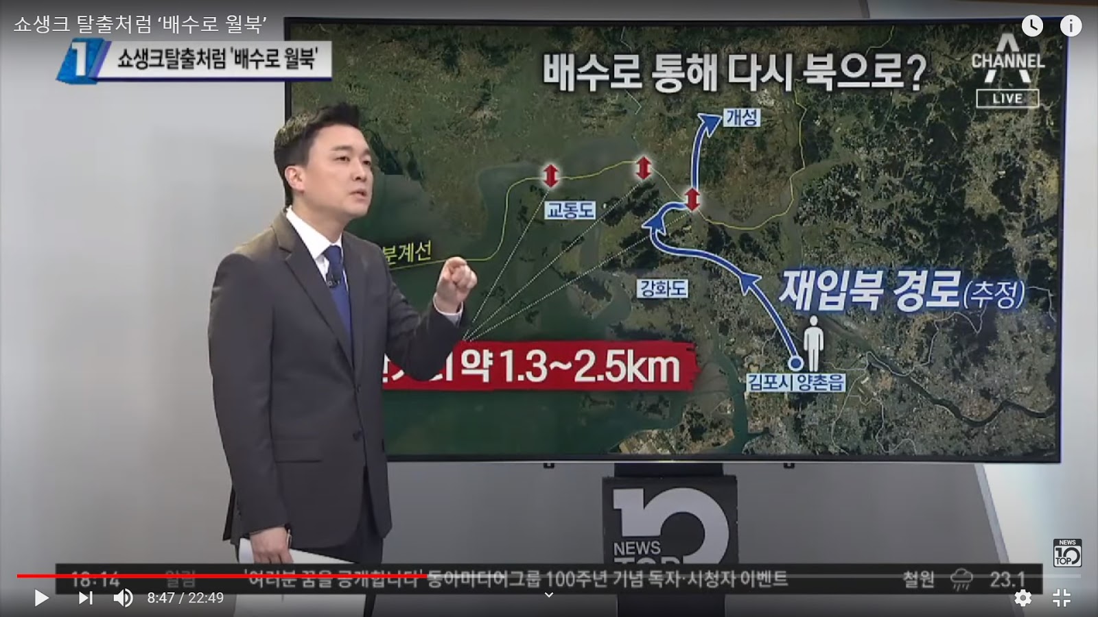(Source- ChannelANews Top 10 7.27) The red arrows show potential crossing points across the DMZ/ line of demarcation. The speculated route ends at Kaesong, North Korea.
