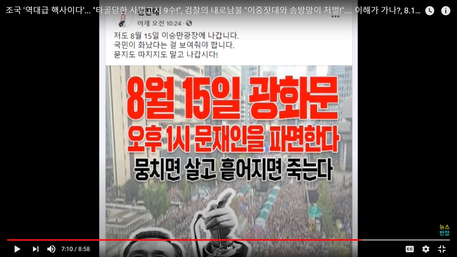 (Source- 뉴스반장 Aug. 14 ) Typical right wing social media post advertising the unlawful assembly in Seoul. "Independence Day Assembly at Gwanghwamun on August 15. Expel the administration of Moon Jae-in. United we will live, dispersed we will die."