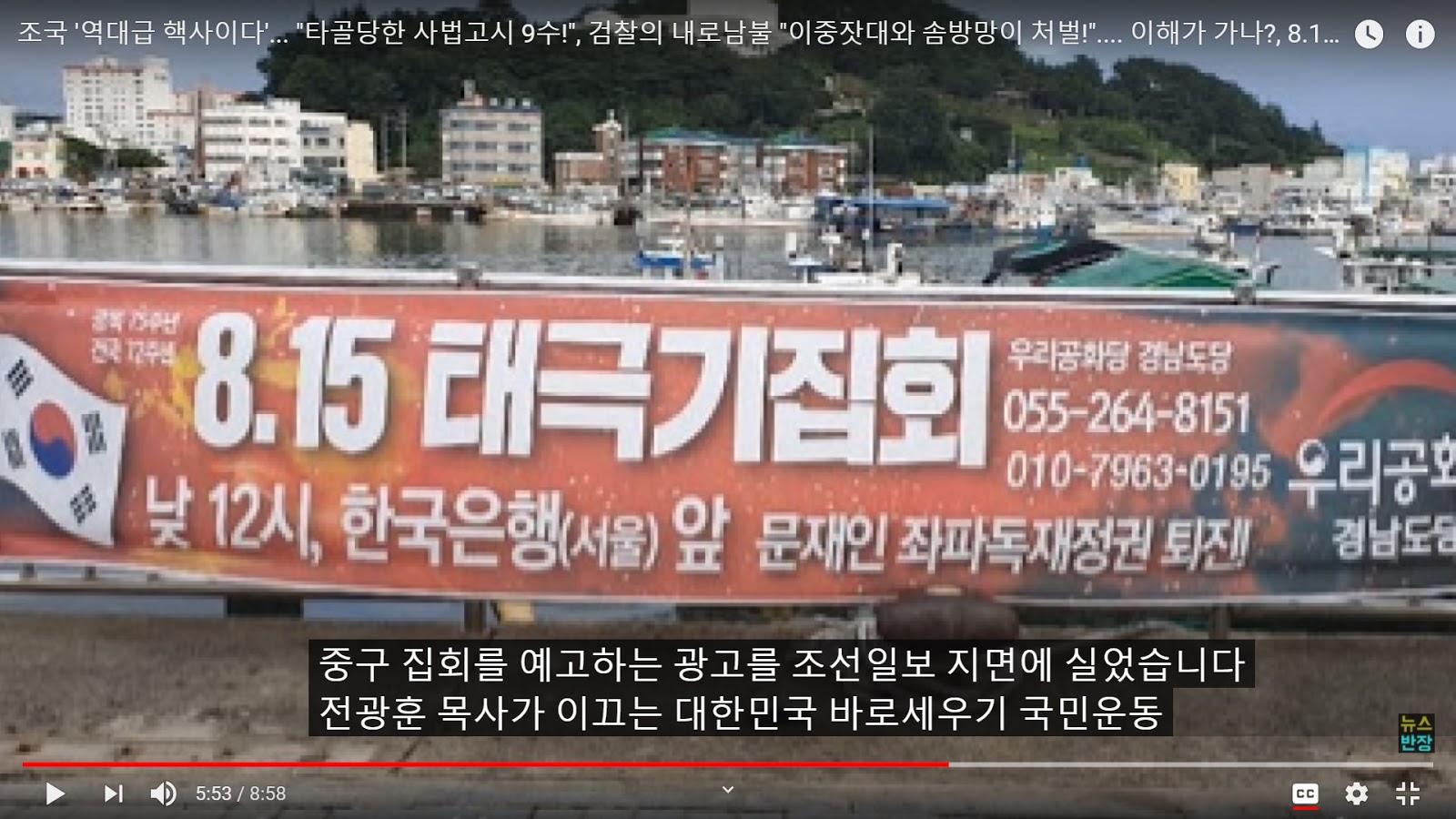 (Source- 뉴스반장 Aug. 14 ) Political banner in Gyeongnamdo. Taegukki (South Korean Flag) assembly in Seoul, August 15. Remove the left wing dictatorship of Moon Jae-in. Advertisements for the demonstration were also carried in the conservative Chosun Ilbo newspaper.