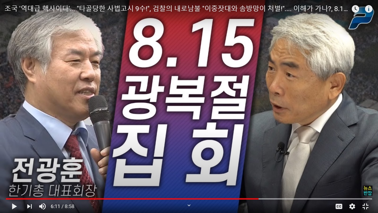 (Source- 뉴스반장 Aug. 14 ) Pastor Jeon Gwang-hun, (left) leader of the controversial right wing evangelical Christian Council of Korea. Last January Jeon was found guilty of ten charges of violation of public election laws involving illegal fund raising. He was released on bail April 20 pending rehearings on appeal. One of the conditions of bail is that he not attend political assemblies. Given his lawyer's arguments in court, he may not comply with that condition.
